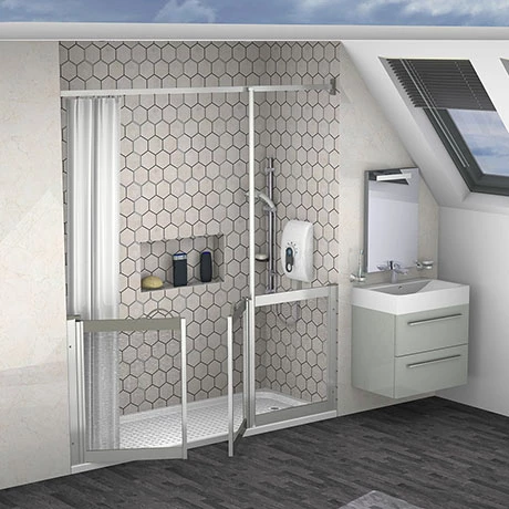 Designed for independent & assisted showering to help retain water in the shower area, the Milton Front Access Half Height Bi-Parting Doors Hinged from Wall & Fixed Panel is ideal for use on shower trays or in wetrooms providing ease of use & installation. The doors are glazed with PET environmentally friendly impact resistant glazing as standard. The flip over latch will prevent door movement should a carer lean against them & will provide a more rigid enclosure while the rise & fall hinges lift the door by at least 10mm & are easy to operate & highly manoeuvrable. The Easy to grip ‘D’ handles supplied for users with limited strength. Supplied as standard with a 2000mm drop antibacterial protected shower curtain and rail.